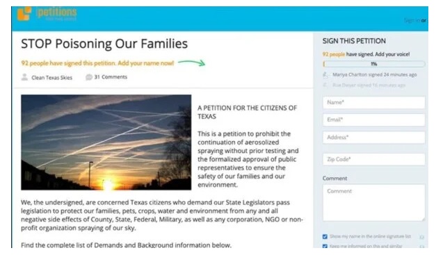 V peticiji, ki je bila nedavno objavljena na ipetitions.com, skupina Clean Texas Skies zbira podpise prebivalcev Teksasa, da od zakonodajalcev zahteva, da sprejmejo zakone, ki prepovedujejo razprševanje atmosferskih aerosolov (Chemtrails) brez predhodne odobritve in testiranja uporabljenih kemikalij. pljuska po nebu.