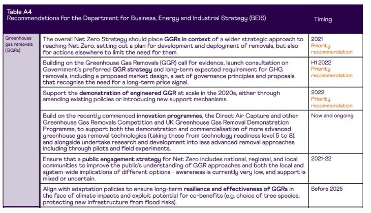 Vlada je pozvala nacionalno komisijo za infrastrukturo, naj preuči tehnologije odstranjevanja toplogrednih plinov. Končno poročilo študije – Predvideno odstranjevanje toplogrednih plinov – je bilo objavljeno 29. julija 2021. Vlada je priporočila, naj se zaveže k široki uvedbi novih tehnologij toplogrednih plinov do leta 2030, kar je dvajset let prej, kot je leta 2019 zaht zakon.