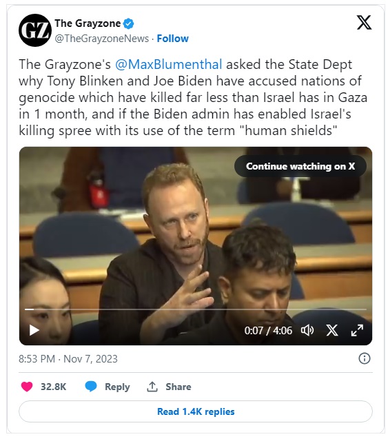 InfoVors poroča: Po predstavitvi dokazov, da najvišji izraelski vladni uradniki želijo zagrešiti genocid nad Palestinci, je Blumenthal vprašal tiskovnega predstavnika State Departmenta: "Katero metriko uporabljate za določanje genocida ali je to samo politična retorika?"